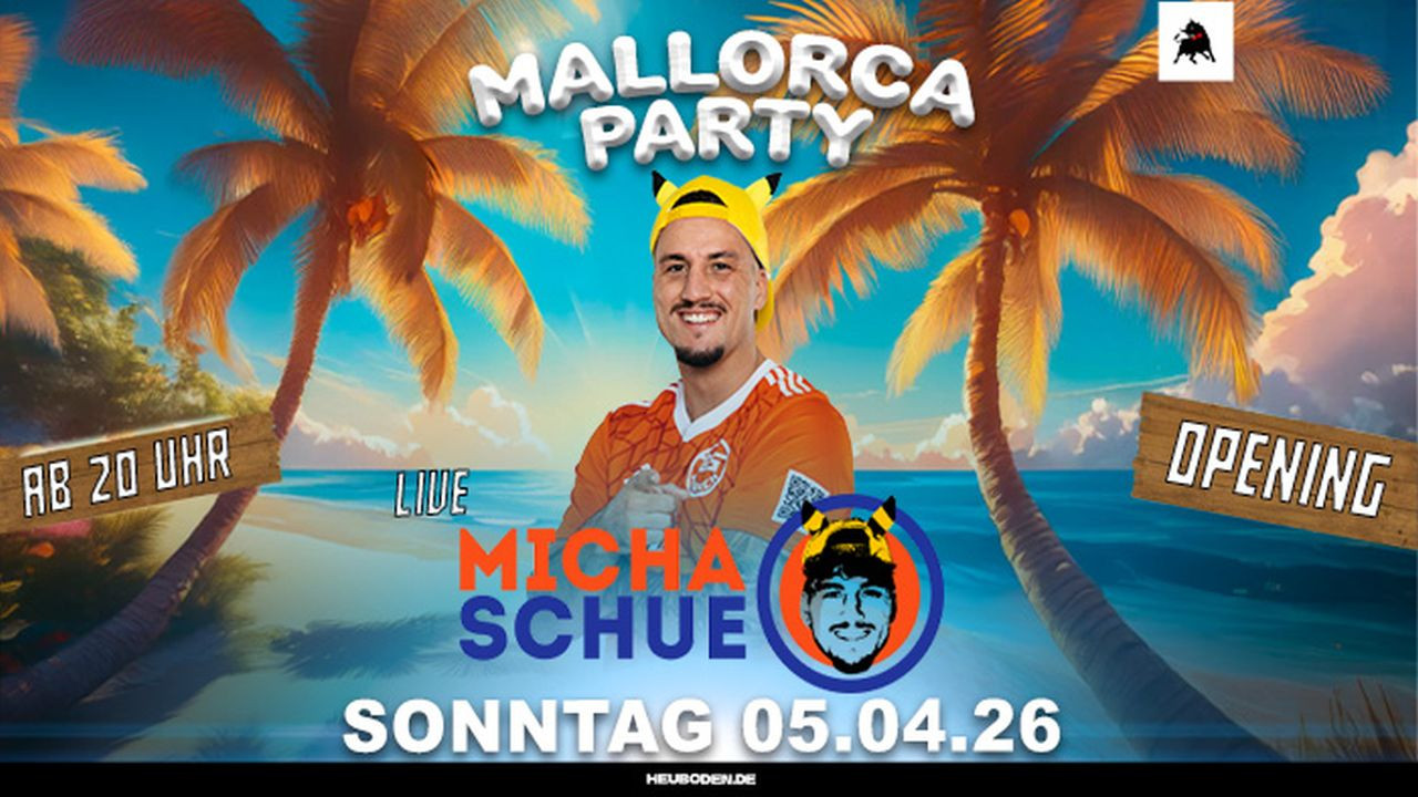 Das Mallorca Opening im Heuboden mit Micha Schue – starte die Party-Saison mit den besten Beats und Urlaubsfeeling pur! Feiere ab 20 Uhr, tanze zu Mallorca-Hits und lass dich von Micha Schue live richtig einheizen!